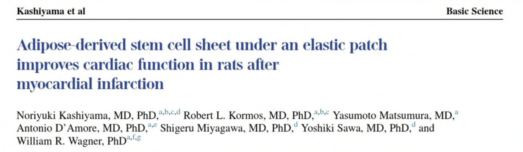 - Kashiyama, N., Kormos, R., Matsumura, Y., D’Amore, A., Miyagawa, S., Sawa, Y., & Wagner, W. R. (2020). Adipose derived stem cell sheet under an elastic patch to improve cardiac function in rats after myocardial infarction. The Journal of Thoracic and Cardiovascular Surgery.