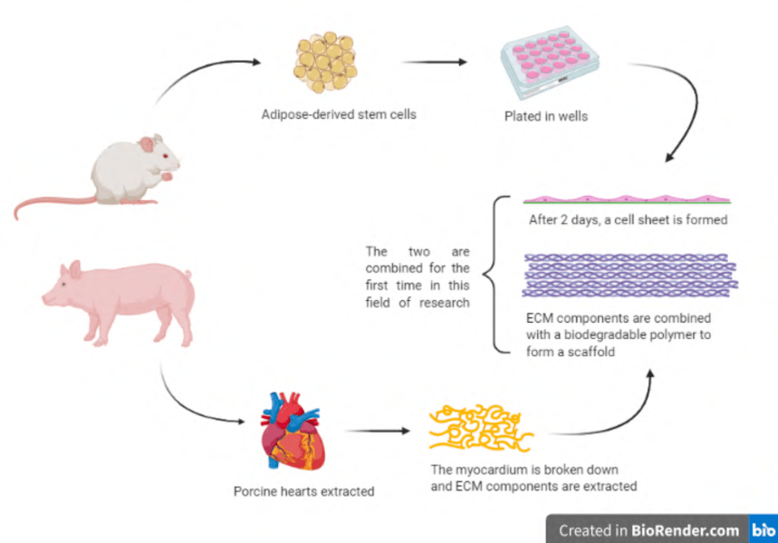 How did they do it? Adult stem cells were isolated from the adipose located in the Inguinal region of mice. After 10 days of standard stem cell culture, the cell aggregates were plated into wells and given 48 hours to form a cell sheet. For the cardiac patches, porcine hearts were decellularized and the extracellular matrix components were extracted and then electrosprayed onto a biodegradable polymer scaffold. The left anterior descending (LAD) coronary artery was surgically ligated in mice to induce MI. The mice were then treated with either (i) cell sheet (ii) cardiac patch (iii) cell sheet + cardiac patch and (iv) sham surgery (4).