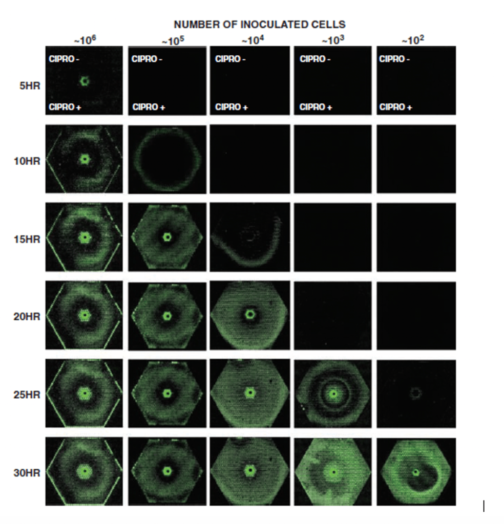 In the first paper, the researchers used the microfluidic system to expose several E. coli to ciprofloxacin (a genotoxic antimicrobial) concentration gradient. This concentration gradient mimicked those seen in patients on treatment as it is often difficult to obtain adequate amounts of antibiotics at infection sites due to their location. This experiment turned the current understanding of resistance on its head [1].
