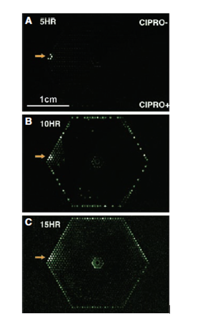 In the first paper, the researchers used the microfluidic system to expose several E. coli to ciprofloxacin (a genotoxic antimicrobial) concentration gradient. This concentration gradient mimicked those seen in patients on treatment as it is often difficult to obtain adequate amounts of antibiotics at infection sites due to their location. This experiment turned the current understanding of resistance on its head [1].