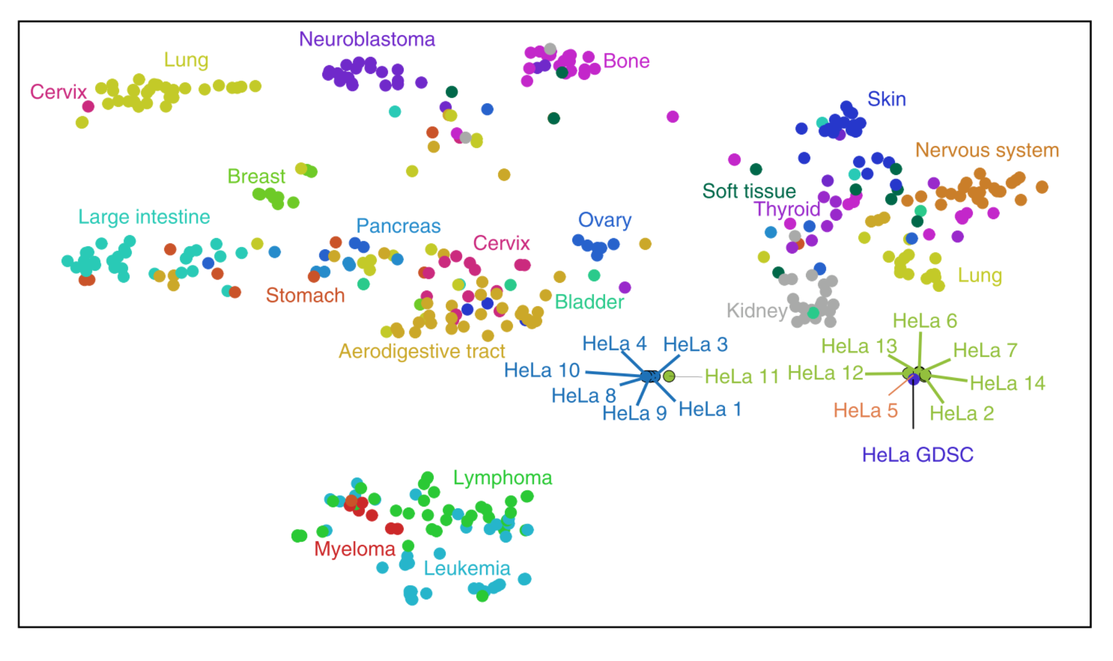 There are thousands of studies that relay on cell line, particularly cancer and immortalized cell lines in their research, acquired and cultured from other laboratories. This together with genomic instability, allows for clonal selection and diversification between different laboratories and a gradual change of a cell line in the same laboratory as these cells are cultured over and over again. Consequently, this poses a major challenge as the variability and render reproducibility on only a subset of cells. Figure 1 below demonstrates how profound these variations are as two Hela cell lines (Kyoto – blue and CCL2- green) are as different as cell lines from various tissues.