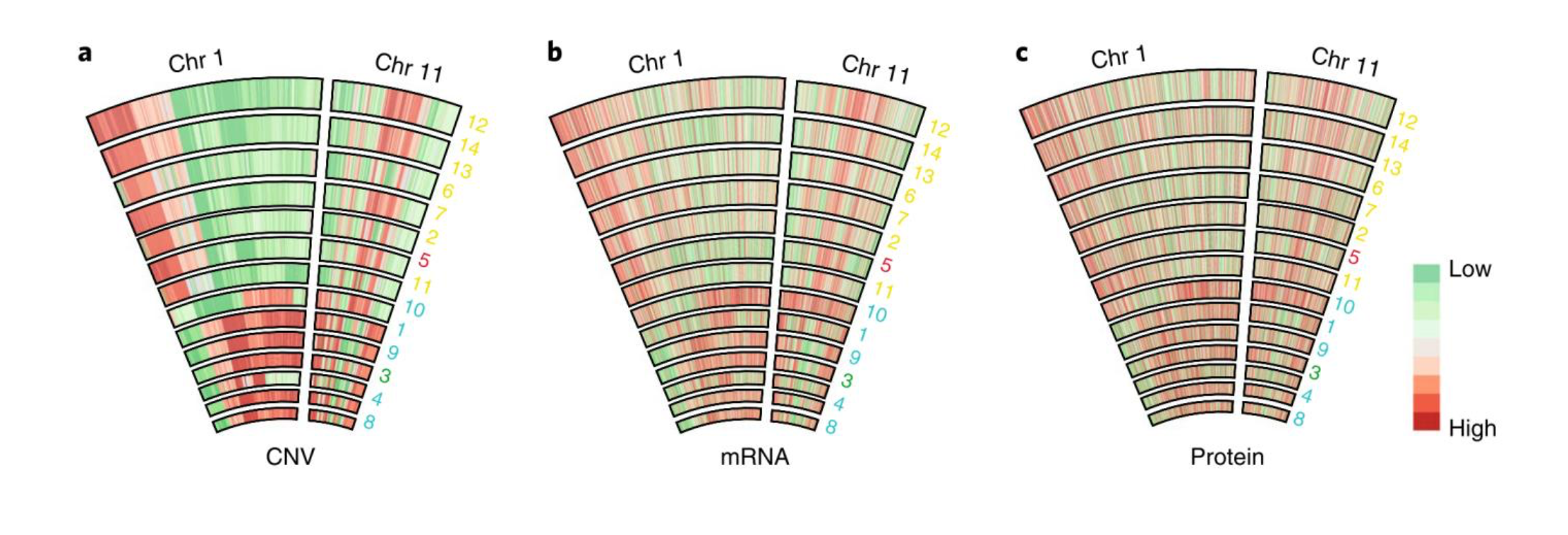 A different layer is the proteome of a cell, which is tightly corelated with the phenotype but cannot be necessarily corelated with the genome. Variation analysis in kypto Hela cell line shows that there is a poor correlation between protein and mRNA levels (p = 0.04). Figure 2 below further emphasizes this as the variation in CNV translates to variation in mRNA but not to the protein levels. This Means that cell cannot be authenticated solely on the basis of the genome and a proteomic analysis is also necessary for an acceptable cell line authentication.