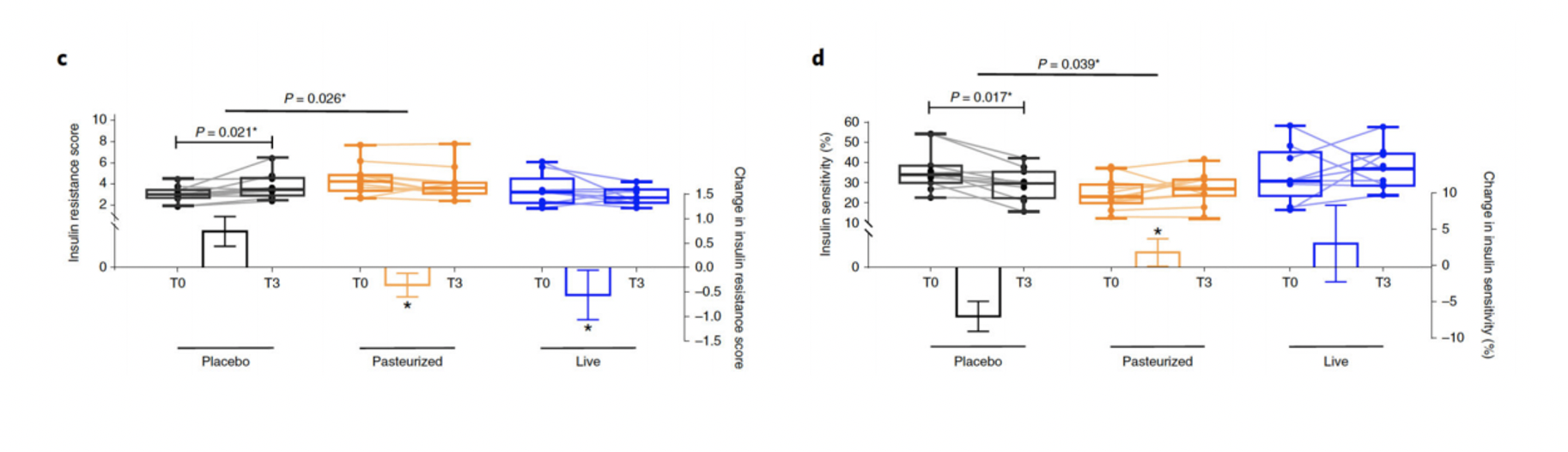 As seen in the graphs above, live and pasteurized A. muciniphila significantly reduced insulin resistance by reducing the insulin resistance score while pasteurized A. muciniphila significantly improved the insulin sensitivity index.