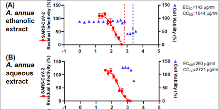 Figure 1: Results from Zhou et al, 2021 showing the effect of A. annua extracts on SARS-CoV2 growth and normal cell viability.