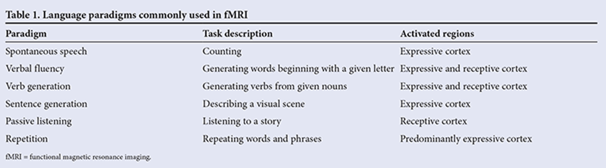 To see which brain regions are responsible for language, Ives-Deliperi et al performed blocked tasks in which patients were subjected to a stimulus at active to activate the brain regions, while at rest no stimulus was given.
