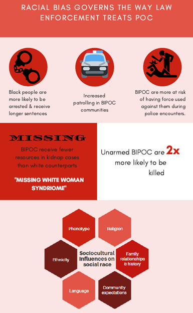 Ancestry estimation is performed by analysing 17 morphoscopic traits. Only 5 of these traits have been linked to hereditary information and poor knowledge exists on how the remaining 12 may be associated with estimating geographical origin. This is problematic since the public relies on the science we produce. By unintentionally perpetuating racial and social assumptions and stereotypes, we legitimise these incorrect notions, which ultimately reinforces the status quo, all while providing the public with misinformation. On one hand, casework statistics support the estimation of ancestry since it has the power to narrow down the missing persons list during investigations. However, by including it on forensic reports, we do not know what effect it may have on the outcome of cases, especially since racial bias from the investigating officers’ perspectives could result in longer periods of identification for POC. A hypothesis that has been reinforced in society with the notion of “the missing white woman syndrome”- where women of colour receive less media coverage and resources during abduction cases as opposed to their white counterparts. The image below depicts the racial bias present in the American justice system, which further provides support for the argument.