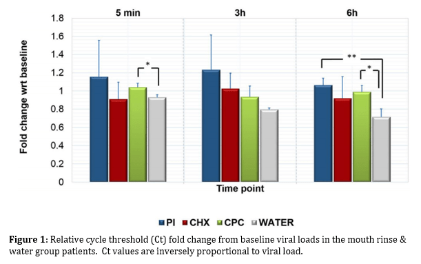 The results showed that CPC & PI mouth-rinses have a sustained effect in reducing the viral load compared to the control group. This is due to the fact that both CPC & PI disrupt the lipid membrane of SARS-CoV-2 and therefore interfere with the ability of the spike protein to bind to the ACE2 receptor of oral mucosal cells. CHX-based mouthwash did not show a significant reduction in viral load (Figure 1).