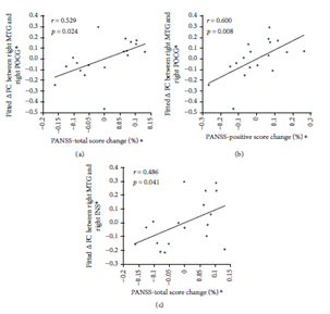 The results below also showed a positive correlation between functional connectivity improvement and symptom improvement in the schizophrenic patients treated with music therapy.