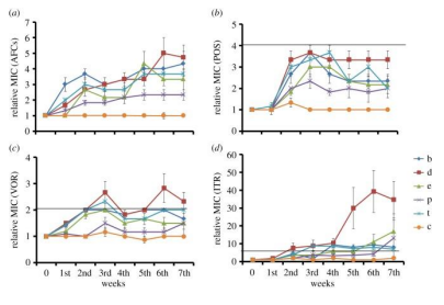 The observable trend from these figures is that, over seven weeks the SI resistant strains develop medical triazole resistance (because of the increasing minimal inhibitory concentration). After whole-genome sequencing the now medical triazole resistant lineages, it was found that there were no structural changes needed to develop this resistance. Put simply, by developing SI resistance Aspergillus fumigatus also developed resistance to medical triazoles.