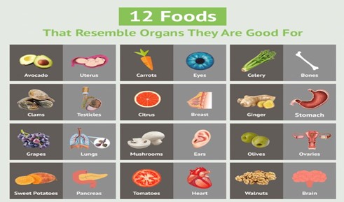 Figure 2: info graphic representation of certain medicinal plants (fruits and vegetables) and resemble organs that they are good for.