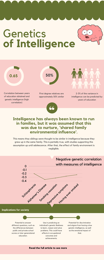 The main findings of the paper are presented in the infographic bellow. Since this is a review, the authors confirmed that there have been multiple attempts to gauge the effect of genetics on intelligence, but the most recent success has come from the use of GPSs. At the time this paper was published, there was also a much larger scale GWAS study being performed that would allow identification of up to 10% of variance. Such studies would allow a clearer definition of the relationship of intelligence with socioeconomic environment, family support, educational attainment of parents and other environmental factors that have so far been attributed to nature in the nature versus nurture debate.