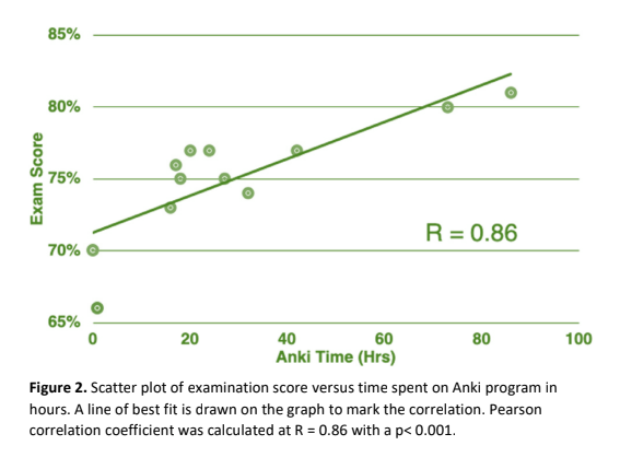 positive correlation between time spent on the Anki program and final examination score (Figure 2). This supported the researcher’s hypothesis that spaced repetition learning using a flashcard format is an effective study strategy for learning material for Orthopaedic examinations. However, one can more broadly conclude that spaced repetition learning is an effective learning strategy for any fact-rich subject.