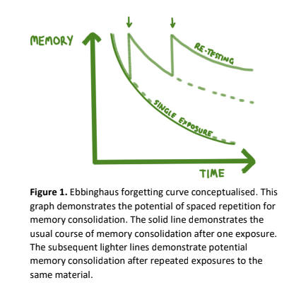 University students spend much of their time studying and preparing for exams. The transition from high school to university can be quite challenging with the increased volume of work and demanding time pressures. Many students struggle to get through vast amounts of content before an exam. However, a solution touted by many is spaced repetition. The idea of spaced repetition has its origins in the late 19th century when Hermann Ebbinghaus proposed a ‘forgetting curve’ (Figure 1). He noted that “frequent repetitions are indispensable in order to make possible the reproduction of a given content” (Ebbinghaus, 2013). Spaced repetition is a learning technique usually performed with flashcards. Flashcards are repeated at intervals to consolidate learning. Newer or more difficult flashcards are shown more frequently, while older less difficult flashcards are shown less frequently. This supposedly makes learning