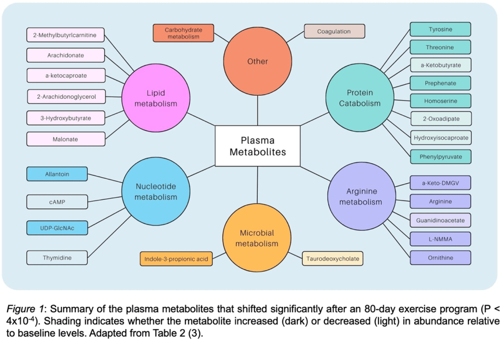 To track changes in metabolic health, the authors compared post-exercise levels of 201 plasma metabolites to their baseline values. Global metabolism was dramatically shifted in the trained soldiers (Figure 1), with changes observed across numerous metabolic pathways and at magnitudes and significance levels heretofore unforeseen.