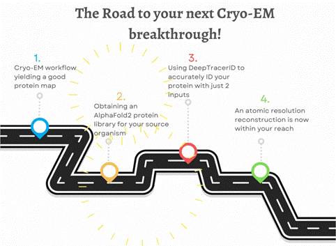 This server-based approach first requires the user to input a cryo-EM map which is used to generate a 3D model trace by DeepTracer. The user then needs to input an easily attainable AlphaFold2 protein library of the organism of interest after which three different alignment algorithms can be used to align the AlphaFold2 predicted structures to the generated 3D model trace. The aligned predictions are then statistically scored and listed from lowest to highest score. The correct protein of interest being predicted to be among those with the lowest scores.