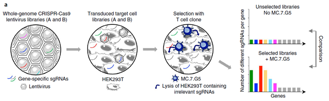 Peripheral blood mononuclear cells (PBMC) were isolated from blood by centrifuge and then cultured with lung carcinoma cells for two weeks. Primed PBMCs were cloned. These T cells are referred to as MC.7.G5. Embryonic kidney cells from the HEK293T cell line were transduced with a library of single guide RNAs (sgRNA) targeting all protein coding genes in the human genome. These sgRNAs direct the Cas9 nuclease to splice out the gene targeted by the sgRNA. This results in a library of HEK293T cells that each have a gene removed. These cells were incubated along with the MC.7.G5 T cells. HEK293T cells that survived were resistant to lysis by the MC.7.G5 T cells. The HEK293T cells were collected, and their DNA was isolated and sequenced using Illumina sequencing. These reads were compared to a control sample of HEK293T cells that were not incubated with MC.7.G5 T cells. sgRNAs that were enriched compared to the control indicated genes that were spliced out and resulted in increased survival. These genes are thus important for recognition by T cells.