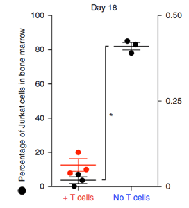 MC.7.G5 T cells were shown to decrease the Jurkat leukaemia cell burden in mice by an average of 95% compared to the control, after 18 days.