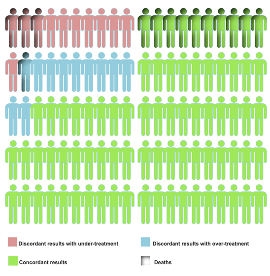 The research shows 22% of local testing was incorrect according to the WGS testing, with half of these cases being inappropriately treated. It was also shown that 28% of mortalities had incorrect resistance testing. The odd ratio showed that patients are 4 times as likely to die when undertreated instead of receiving appropriate treatment.