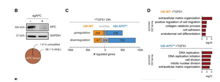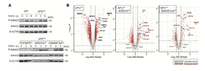 As SMAD4 is a phosphorylated stable form of the TGF-beta receptor, it is translocated to regulate target gene transcription in the nucleus. Mutations in ARID1A and SMARCA4 attenuate the signal transduction from the TGF-b receptor to the SMAD complex, recruited by cofactors, and promote tumorigenesis. To track the SMAD complex function, phosphorylation induction in APCKO/ARID1AKO and APCKO/ SMARCA4KO organoids was conducted and led to SMAD upstream signal transduction, as shown in Figure 4A. RNA-seq of different genotypes evaluated 443 of 1,571 expressed gene were dependent on ARID1A or SMARCA4. As such TGF-beta-SMAD-signaling cascade is still functional and translocates with reduced transcription response of TGF-b-target genes.