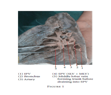 In 53.8% of dissected lungs, the right superior lobar vein and middle lobar vein unite to form the right superior pulmonary veins, Moreover, the right superior lobar vein drained the apical and anterior segments of the right upper lobe and also the medial and lateral segment of the right middle lobe from the anterior surface, whereas veins from the posterior segment of the upper lobe drained into the posterior aspect of the superior pulmonary vein. These lungs fall under Type A, whereby the right superior lobar vein (RSLV) and right middle lobar vein (RMLV) join to form the right superior pulmonary vein (RSPV) as seen in Figure 1.