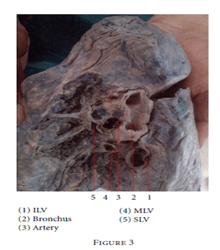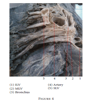 In 26.6% of dissected lungs, the right superior lobar vein and the right middle lobar vein did not join, and all three lobar veins drained separately at the hilum. This belongs to Type B, whereby the right superior lobar vein (RSLV), right middle lobar vein (RMLV), and right inferior lobar vein (RILV) drain separately in Figure 3.
