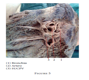 In 3.8% of dissected lungs, the right superior lobar vein, the right middle lobar vein, and the right inferior lobar vein drained into a common vein forming the right single unilateral central pulmonary vein (Figure 5). This belongs to Type D, where RSLV, RMLV, and RILV join to form the right unilateral single central pulmonary vein (RUSCPV).
