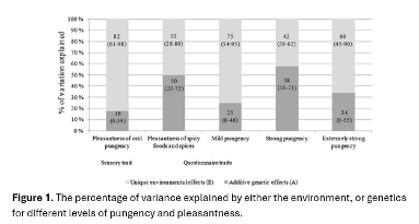 Figure 1. shows that genetic factors accounted for between 18-58% of the variation in how much participants enjoyed spicy foods and sensations, while environmental factors explained the rest. Non-likers of spicy foods perceived the capsaicin-spiked jelly as more intense and rated spicy foods as less pleasant compared to likers.