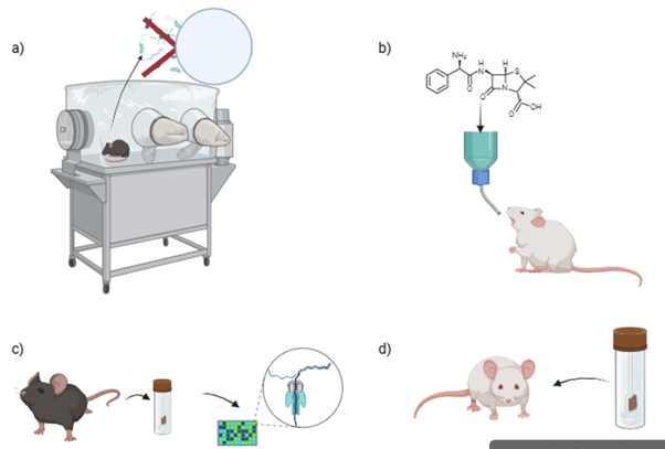 Figure 2: Examples of methods use to study the gut-brain axis in mice: a) breeder isolator used to generate germ-free mice b) treatment of mouse with – in this case – an antibiotic (Penicillin) or pro/prebiotic c) sampling and metagenomic analysis stool samples d) faecal microbial transplant (FMT). Created in https://BioRender.com
