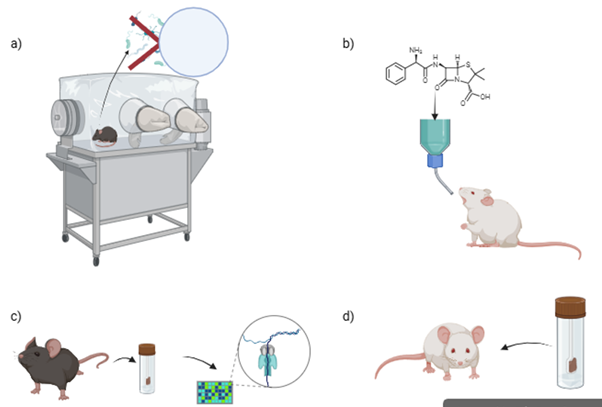 Figure 2: Examples of methods use to study the gut-brain axis in mice: a) breeder isolator used to generate germ-free mice b) treatment of mouse with – in this case – an antibiotic (Penicillin) or pro/prebiotic c) sampling and metagenomic analysis stool samples d) faecal microbial transplant (FMT). Created in https://BioRender.com