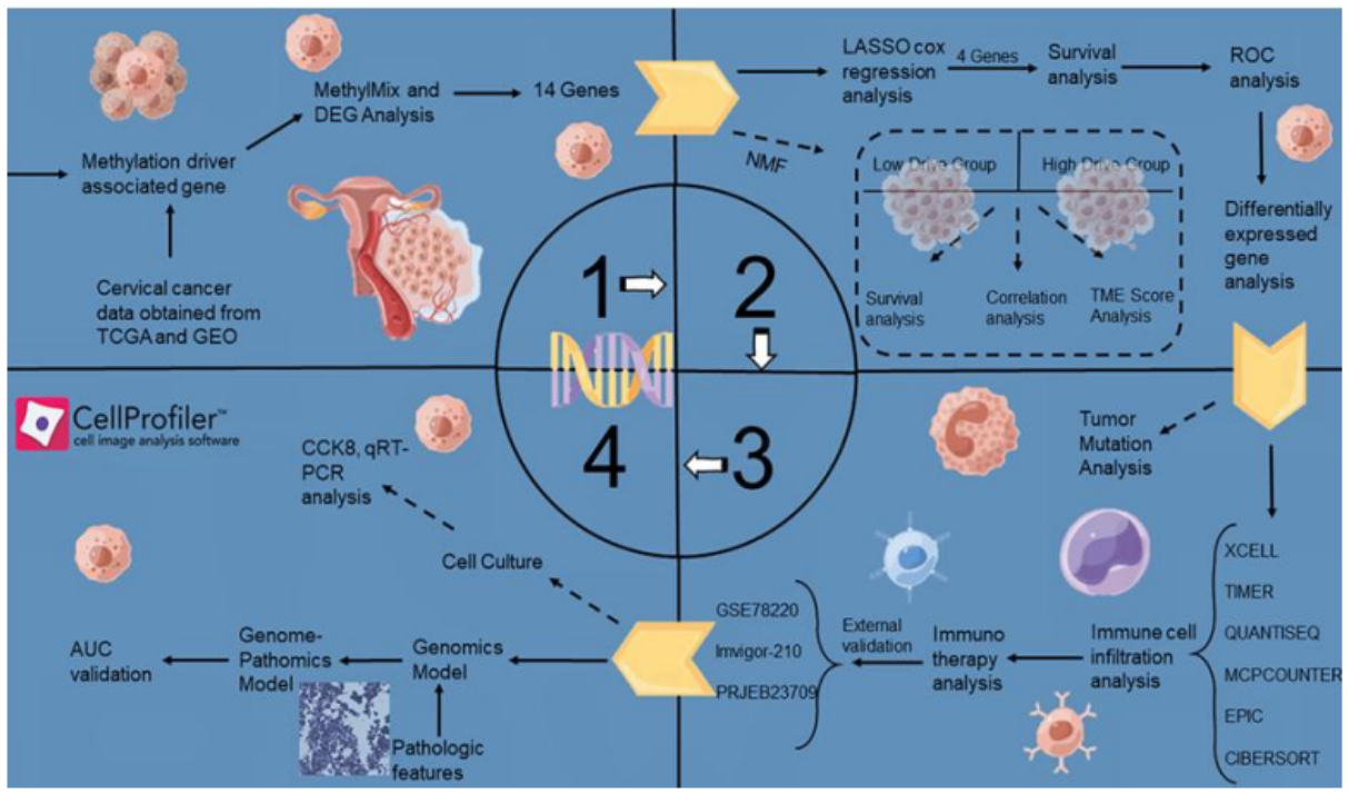 Yu et al. approached cervical cancer in this study as if it were a puzzle that needed to be solved based off of its appearance and DNA. They discovered that “flags” on DNA (Methylation) act as switches that control genes. They identified 14 suspicious genes, which were methylation-driven genes (MDGs), by searching the DNA of cervical