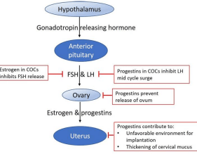 Commonly known as the “pill”, combined oral contraceptive, is a dual-hormone therapy used to prevent pregnancy. The combined pharmacological action of progestins and estrogen prevent pregnancy by inhibiting follicle-stimulating hormone (FSH) and luteinizing hormone (LH) from the anterior pituitary in the brain. The inhibition of FSH and LH prevents the development of follicles into mature eggs (ova) that can be fertilized, and thickens the cervical mucus, making it difficult for sperm to penetrate beyond the cervix. As a result, ovulation cannot occur without a properly developed or released follicle.