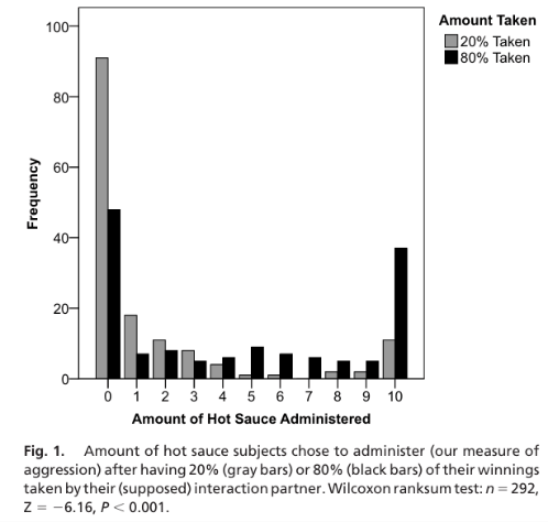 Each participant was given 10 small doses of hot sauce. To punish their partner, the participants could give their partner varying amounts spicy hot sauce knowing the other person dislikes it. Alternately, they could trade the hot sauce for money. The amount of hot sauce given was used as a measure of behavioural aggression.