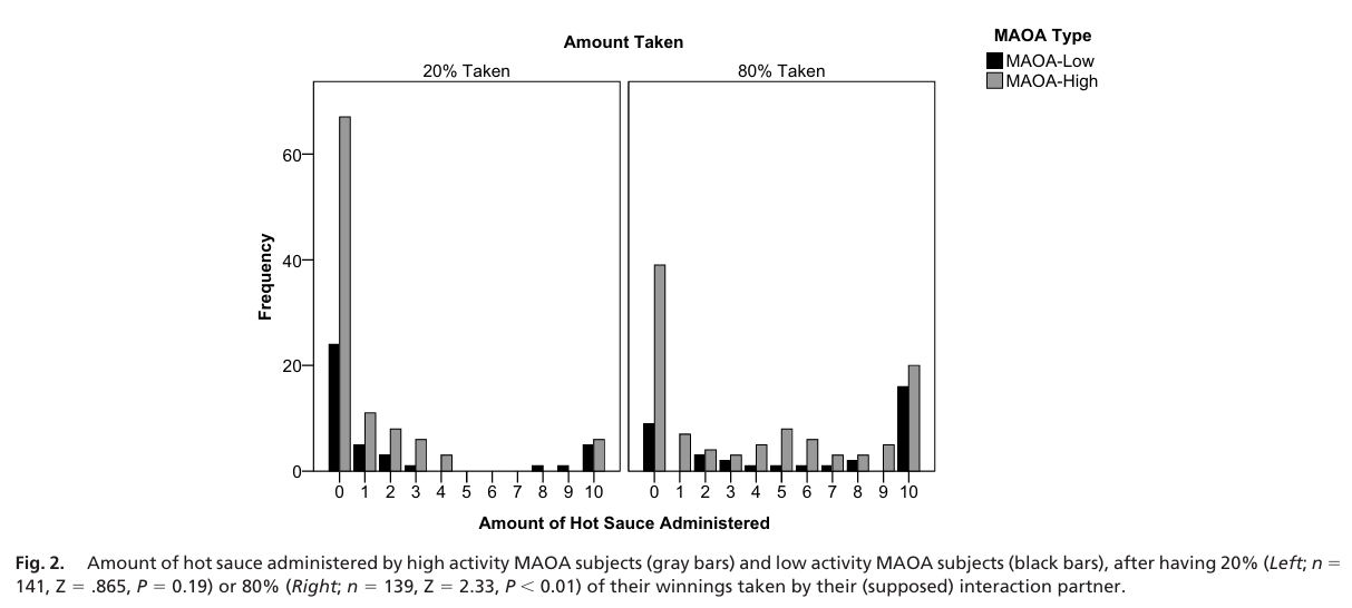 DNA samples were collected from 78 college male participants, and they were grouped as either MAOH-H or MAOA-L carriers. Each participant was told they were paired with an anonymous partner in a different lab (it was actually a computer). They performed a task and awarded money upon the completion. Afterwards, each participant was told their “partner” had either 0%, 20% (low take) or 80%(high take) of their earnings.